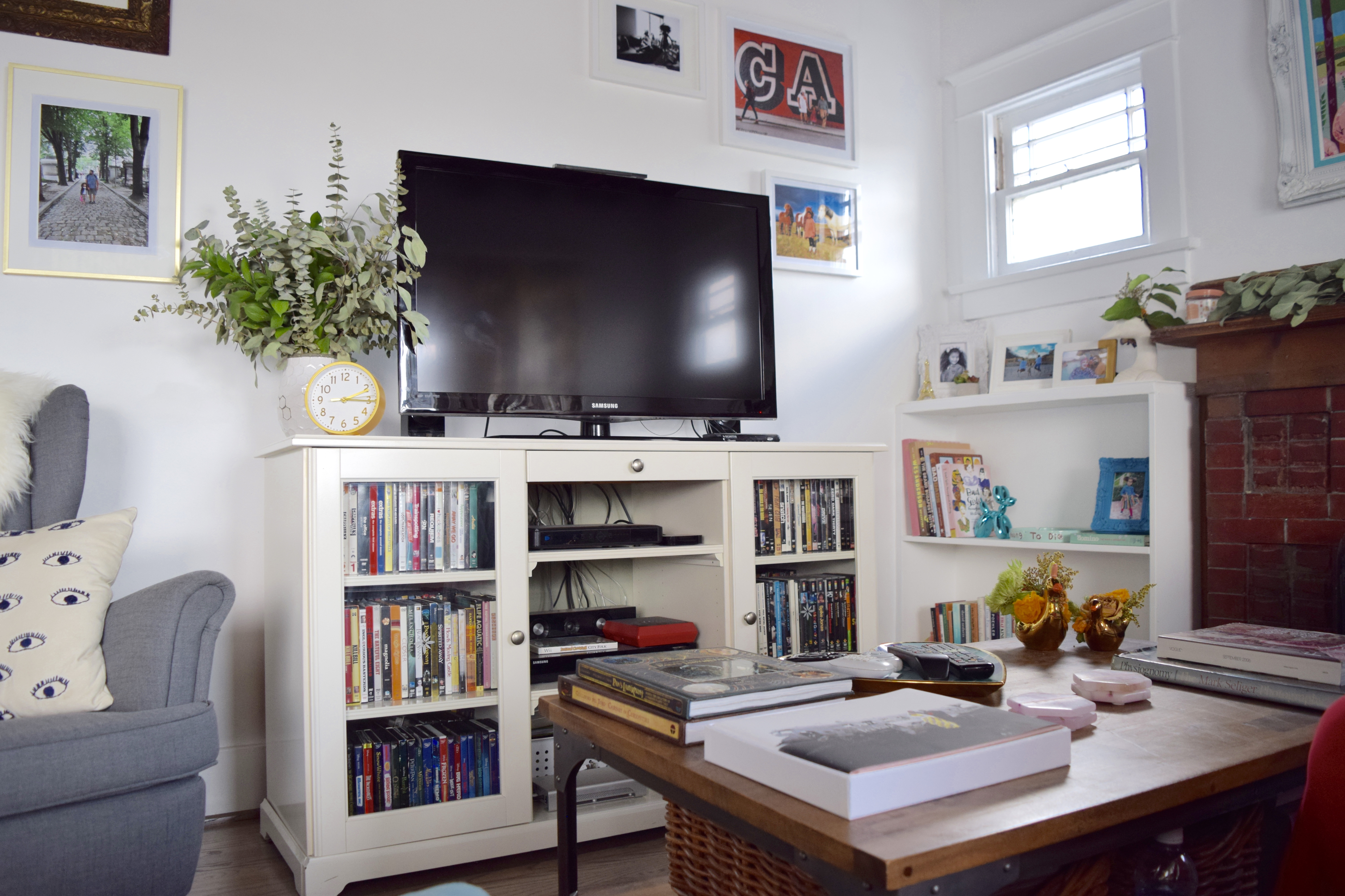 We got rid of the old blue desk and moved a small desk we had in the bedroom in the corner. We had to find a new space for my sewing machine and our crafts. It’s tricky working with a small house (remember it’s under 900 square feet) but the white walls and higher ceiling makes the space feel more open.