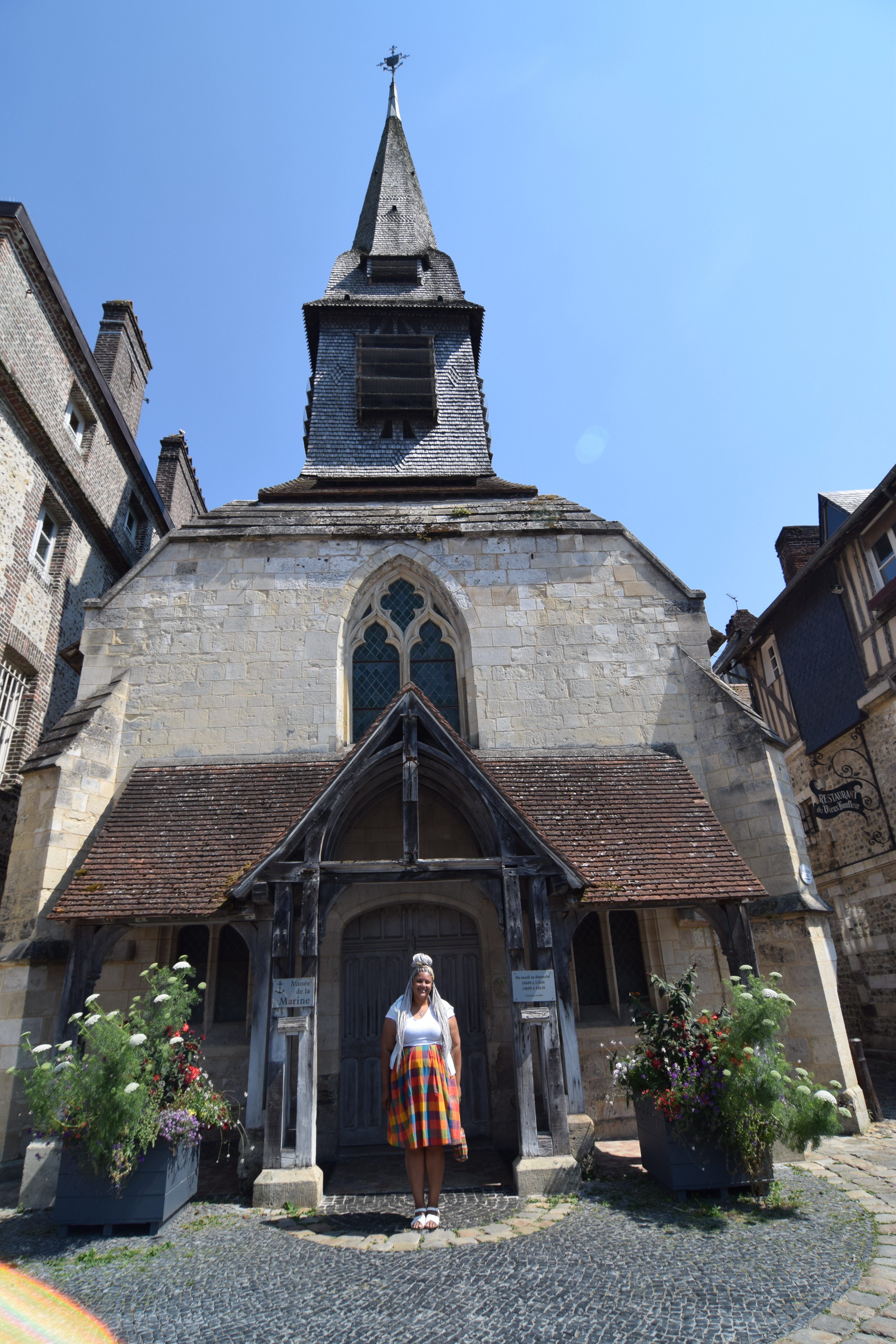 It was a quick two hour drive west so we stopped in the village of Buorneville which is in the Normandy region. We needed to stretch our legs and I had to take a pic in front of this adorable Mairie. Little did we know that we stopped right in the middle of an insect horde and we were covered with hundreds of tiny black bugs. It was awful. Liv noticed them first and next thing we knew they were all over us. I have many things I cannot tolerate and bugs is high on the list. They were in my braids, all over the rental car, in our clothes. I was miserable during the rest of the drive. I planned to take photos of the picturesque village of Pont-Audemer but we just drove through without stopping. We felt like there should be warning signs saying watch out for tiny almost microscopic bugs that don’t bite but crawl all over you! Has that ever happened to anyone else? I still itch just thinking about it.